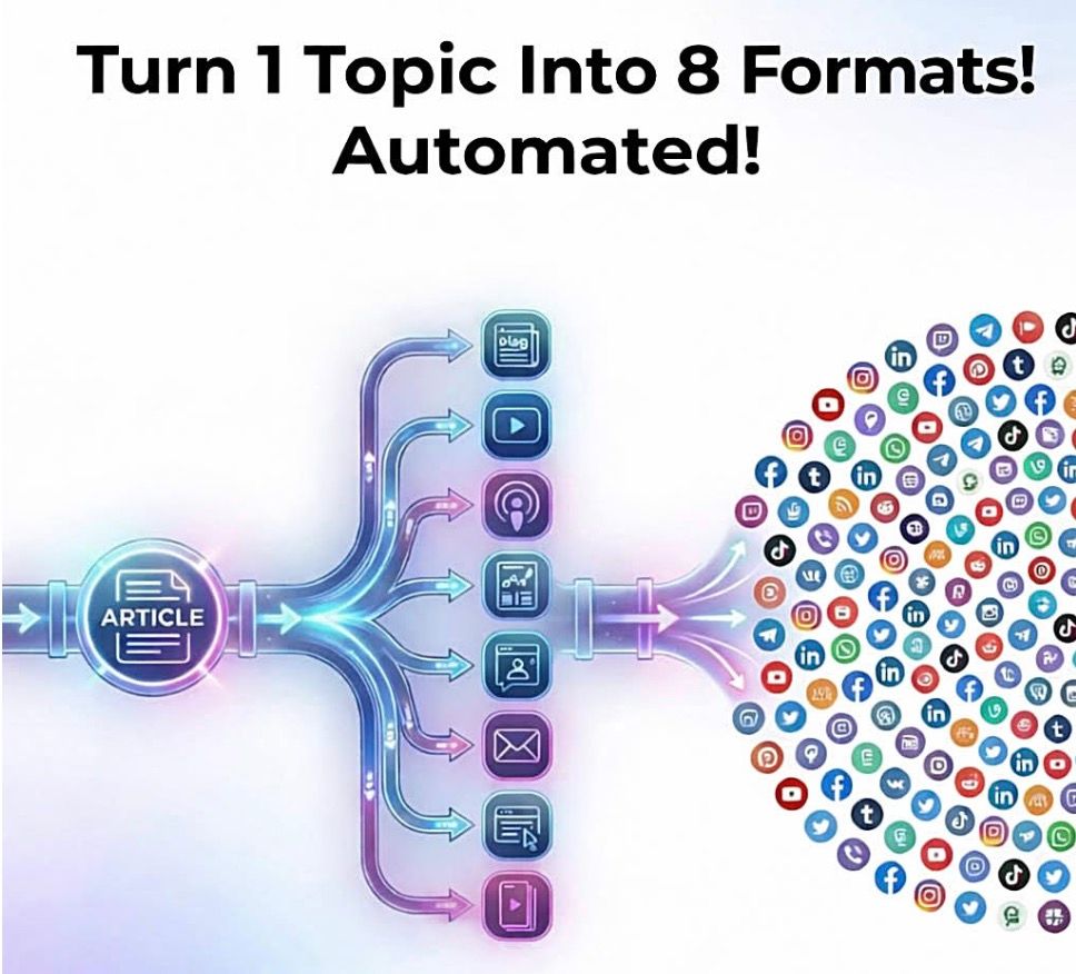 - Content Creation: A single input topic gets transformed into 8 optimized content formats automatically, each one built for its specific platform