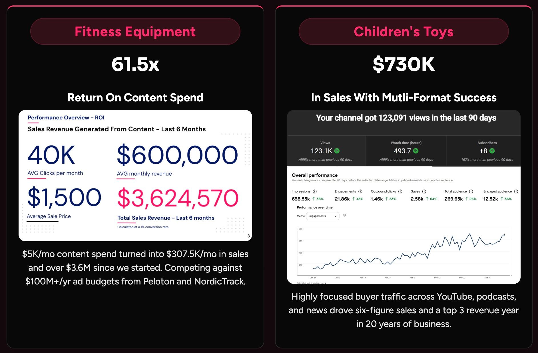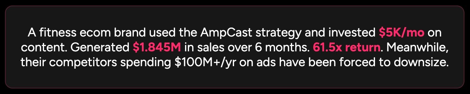 - A fitness equipment brand spending just $5K/month on content generated $307,500/month in sales — a 61.5x return — while competing against TWO $1B behemoth competitors with $100M+ ad budgets.