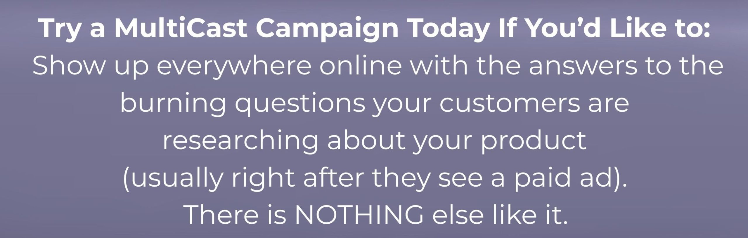 All MultiCast campaigns are expertly created to answer highly relevant questions about your service/product that your future customers are asking (all over the internet) before they make their purchase decision. Your MultiCast is distributed to hundreds of high authority sites IN THE EXACT WAY that Google and AI love, and in 8 formats so that your answers show up everywhere people are asking questions.